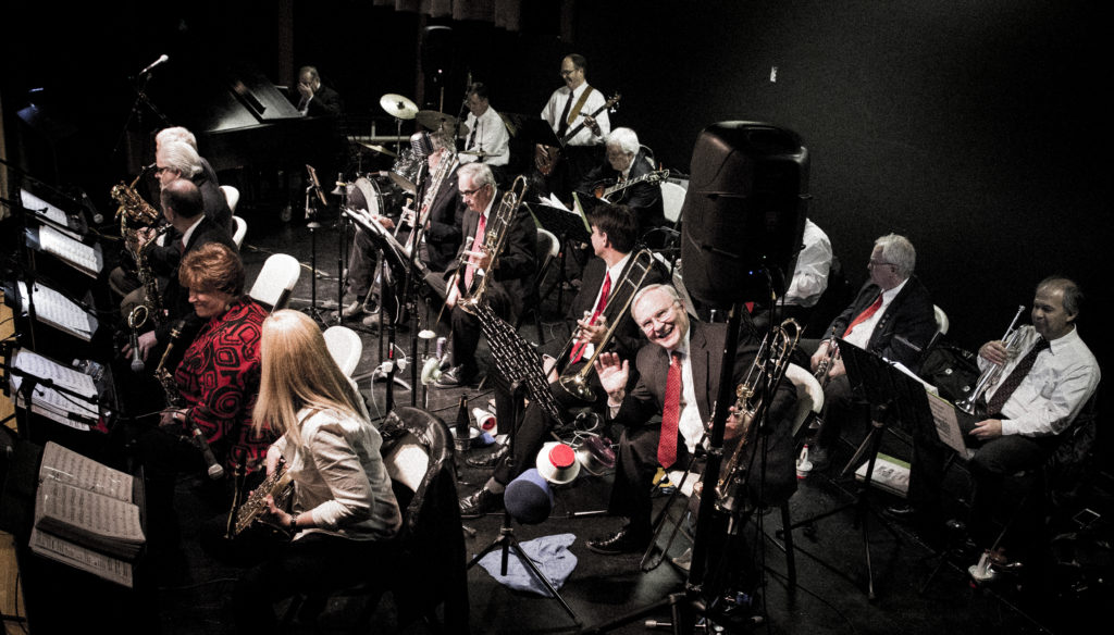 We are truly a BIG Band. Seventeen instrumentalists and 3 vocalists. We require a large stage or a large flat area. We also put out a LOT of sound, so we don’t play too many wedding receptions! When the weather is good we love playing outside, and have played often for outdoor music festivals such as the Heart and Soul Music Stroll which takes place the second Saturday of June. We have opened this event since its beginning – about 10 years now.
